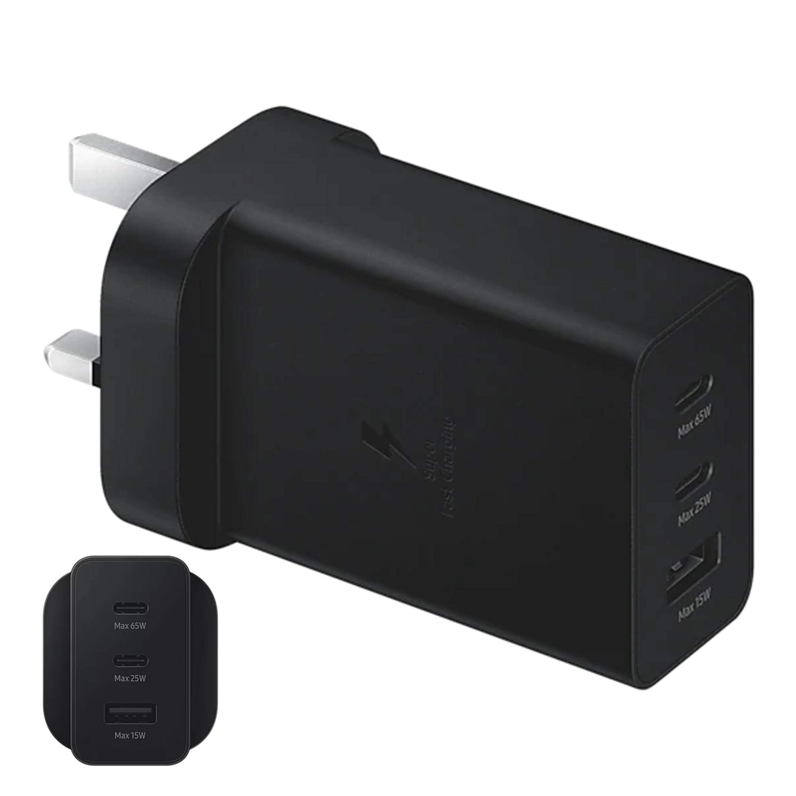 Home Shop Data Cable Samsung 65W Trio Universal Power Adapter UK 3 Pin PD USB-C USB-A Port EP-T6530 Black